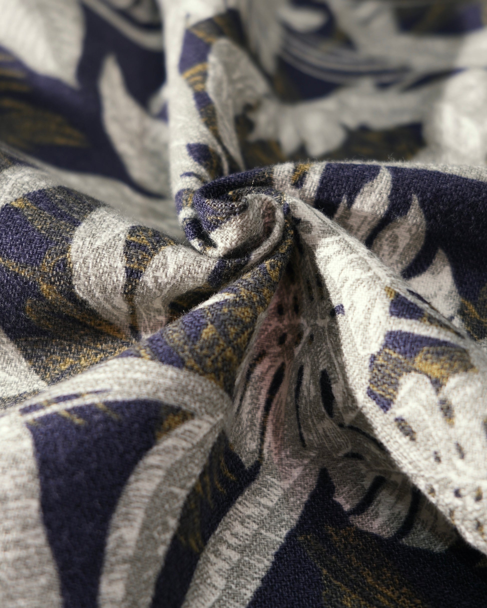 コットンのしなやかさと、麻ならではのさらりとした質感がバランス良く融合し、肌に触れたときの自然な心地よさを生み出しています。夏向きのイメージがある麻素材ですが、 空気を多く含む繊維構造で保温性が高い点も特徴。秋冬シーズンでも暖かく、快適な着用感を保ってくれます。