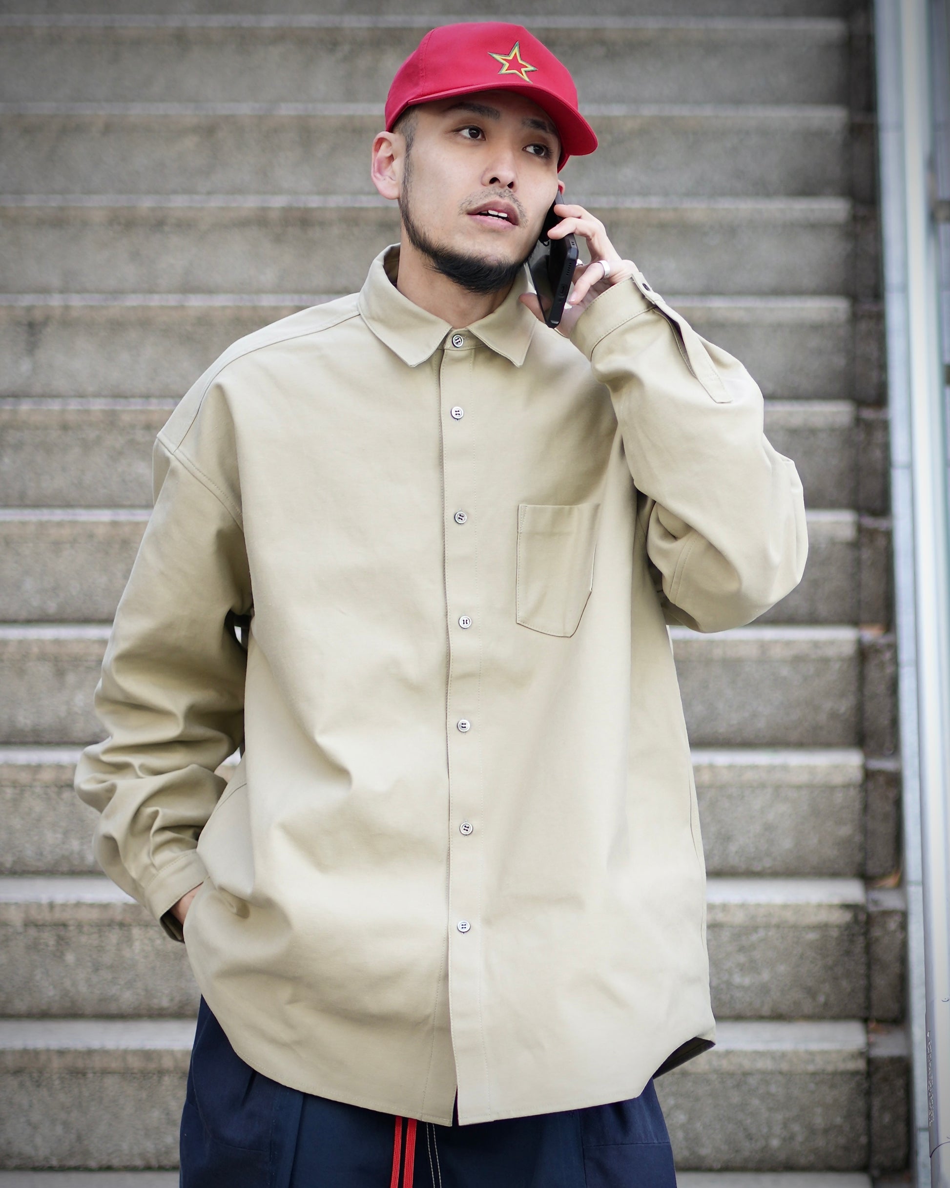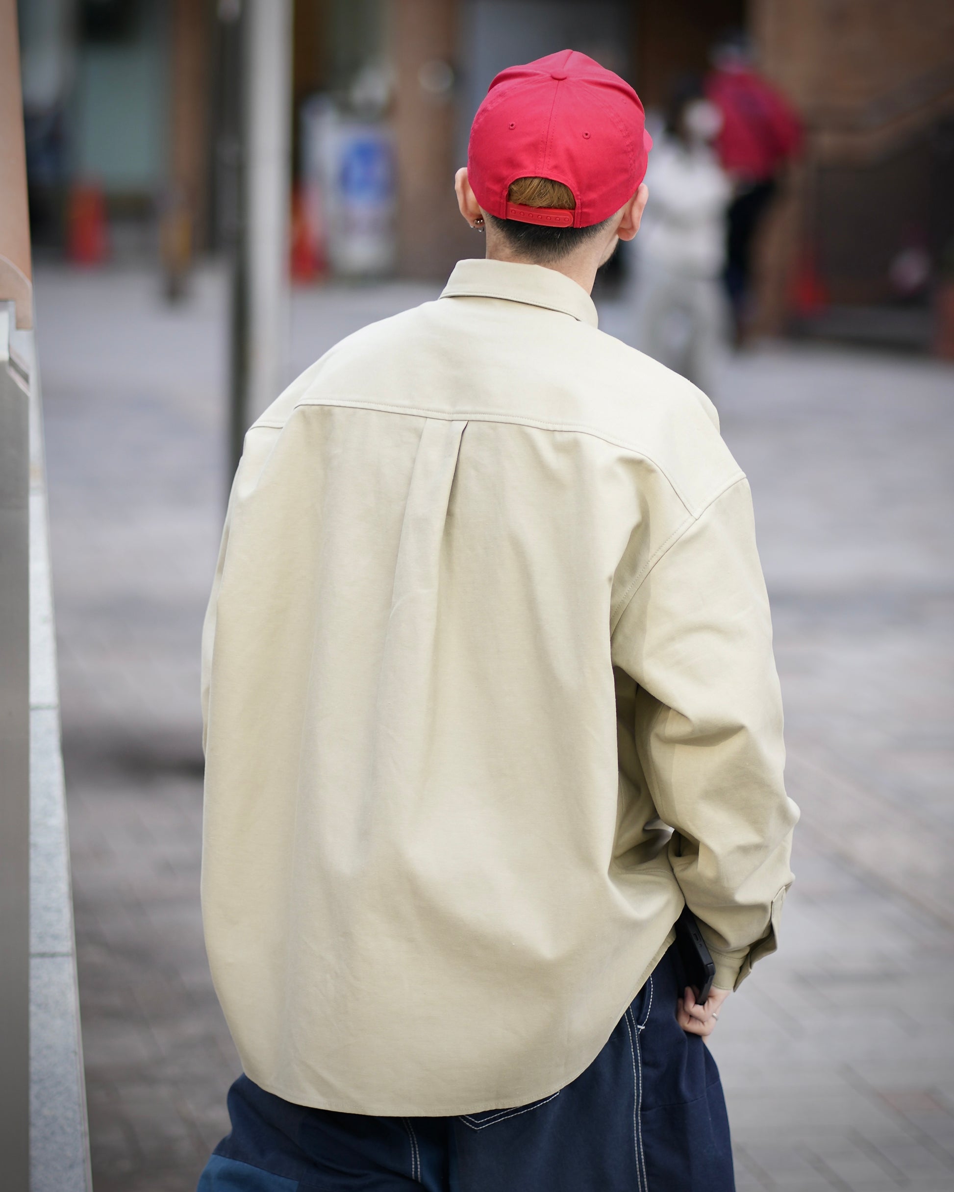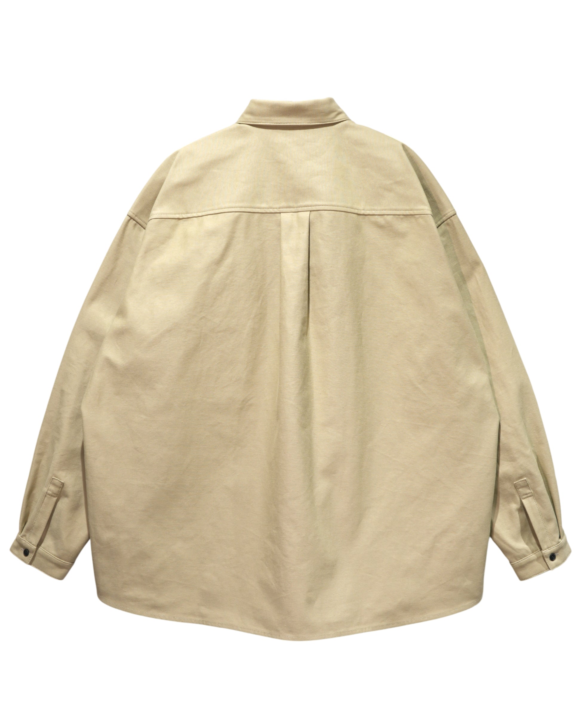 着丈・身幅・肩幅のすべてを大胆に拡張しながらも、ただ大きいだけのビッグシャツと一線を画すため、パターンを崩すことで生まれる独特な落ち感と余白を活かしています。体のラインを一切拾わず羽織るだけでスタイルが完成し、アウター感覚でも着用可能。ラフでありながら不思議とバランスの取れた佇まいを作り出します。