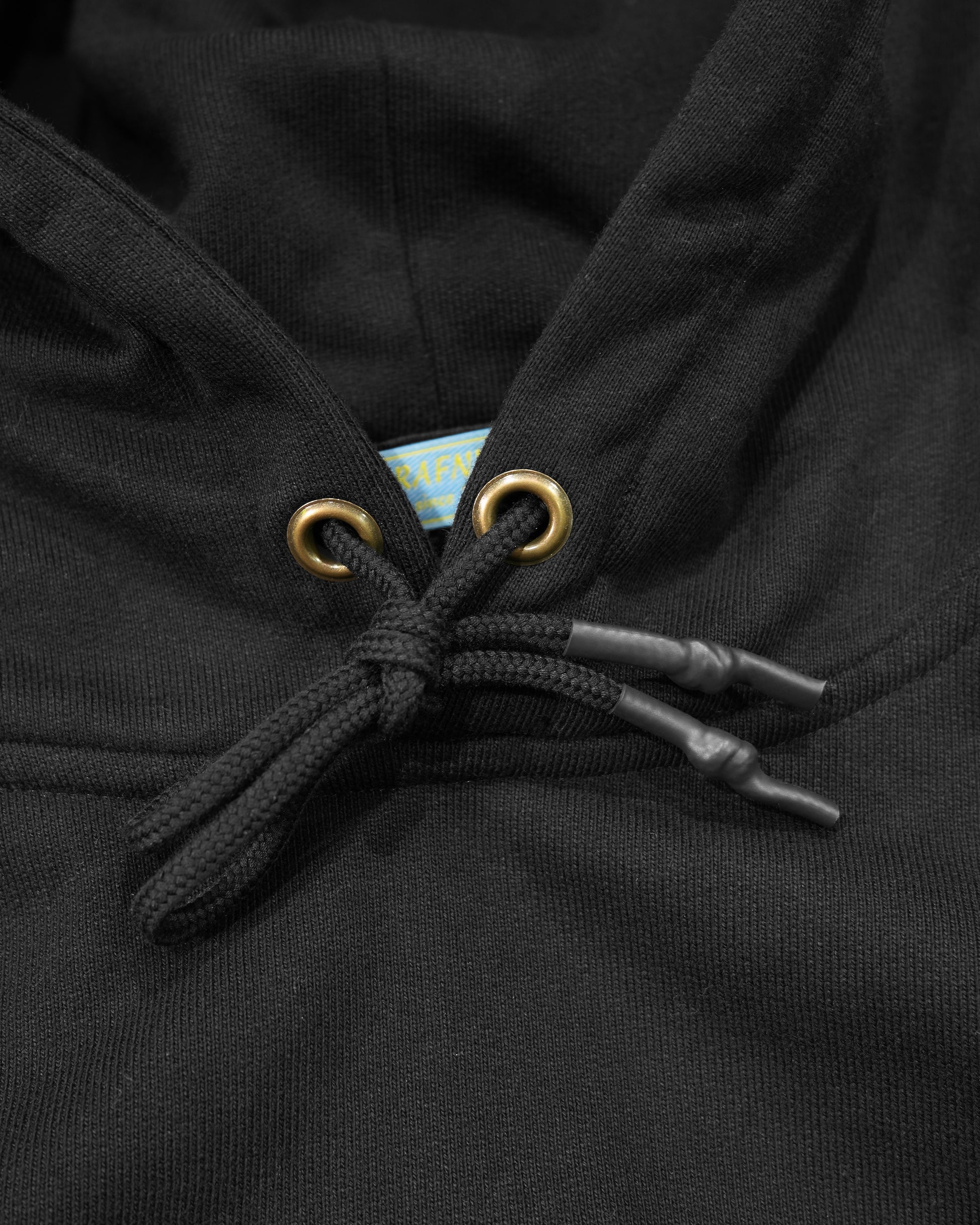 ・フード紐:直径5mmのコットン丸紐を採用 / 紐先はシュリンクチップ加工のオーダーメイド品