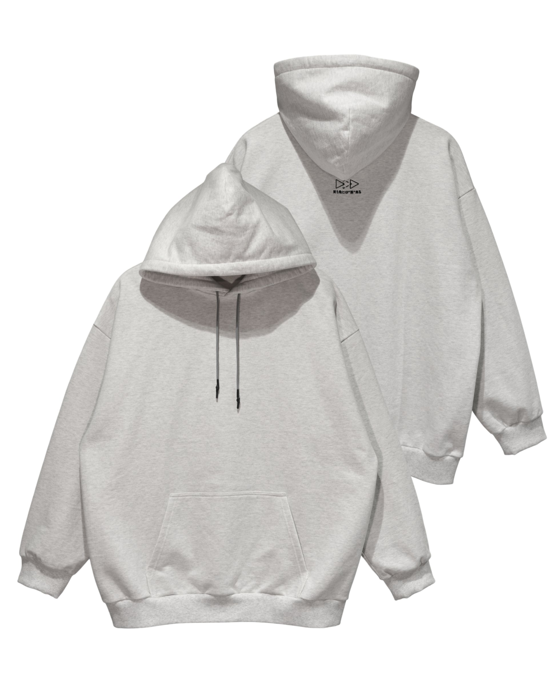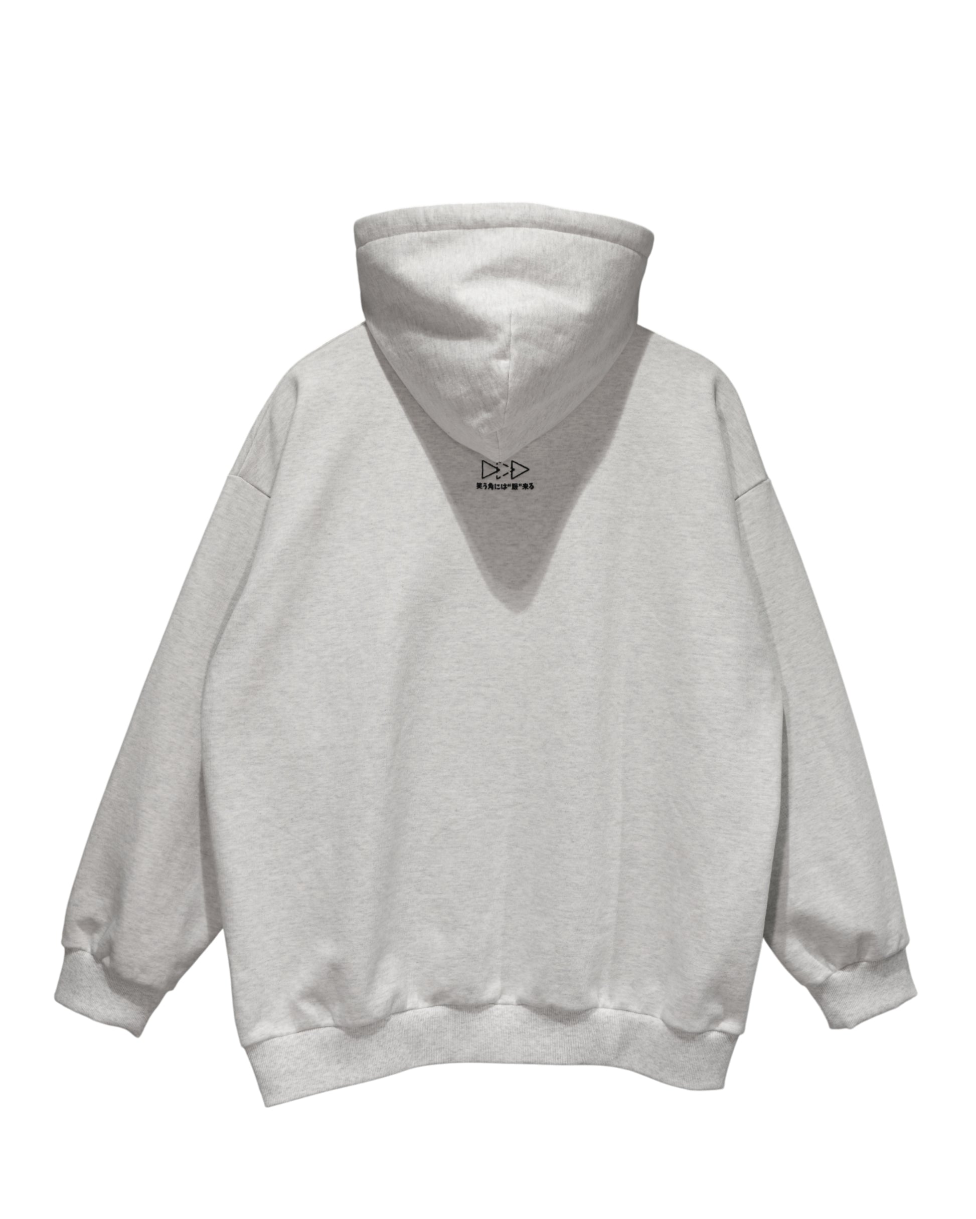 フードを垂らして着たときの見えるか見えないかの絶妙な位置に、「笑う角には“服”来る」という言葉をロゴと共に刺繍。