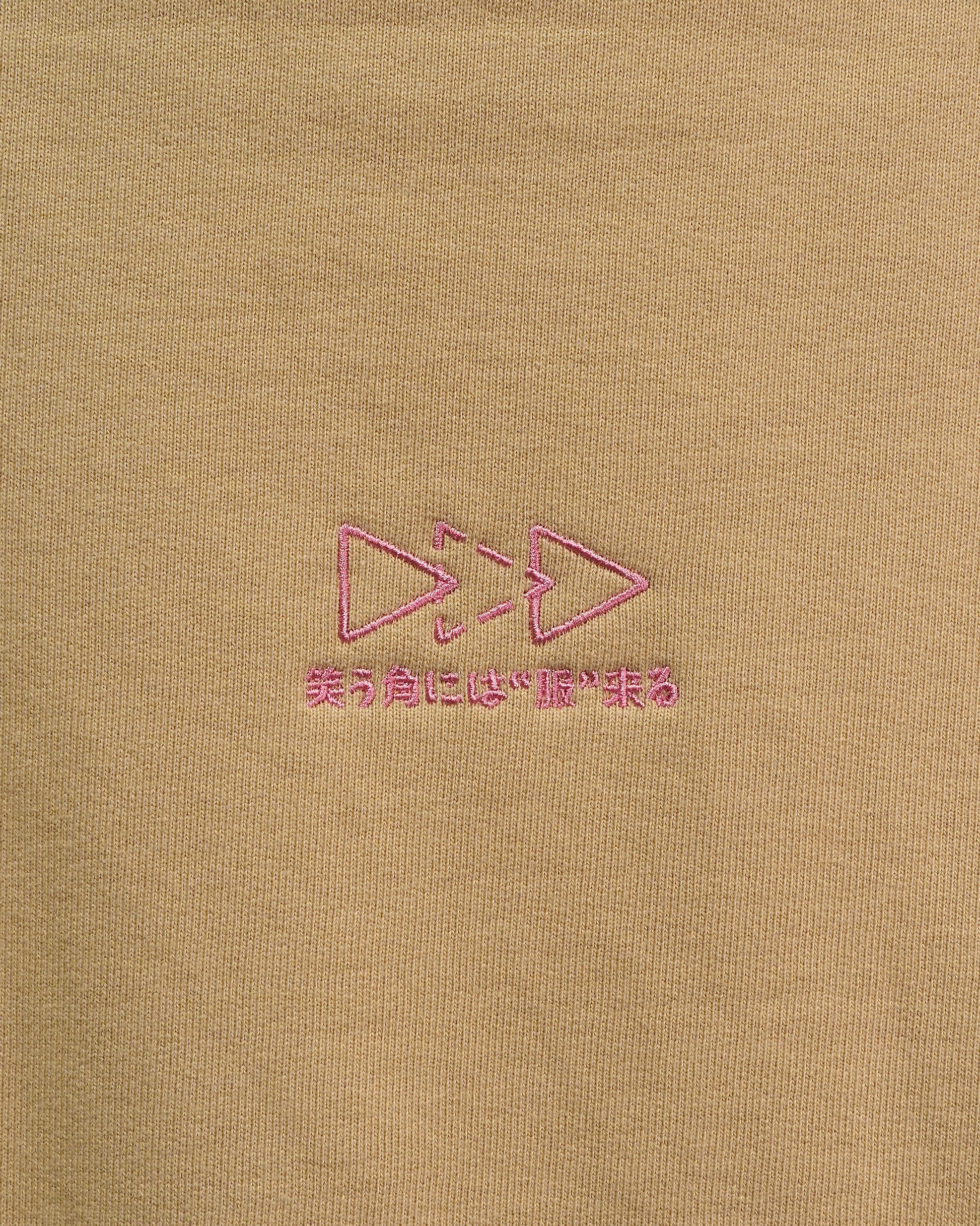 フードを垂らして着たときの見えるか見えないかの絶妙な位置に、「笑う角には“服”来る」という言葉をロゴと共に刺繍。